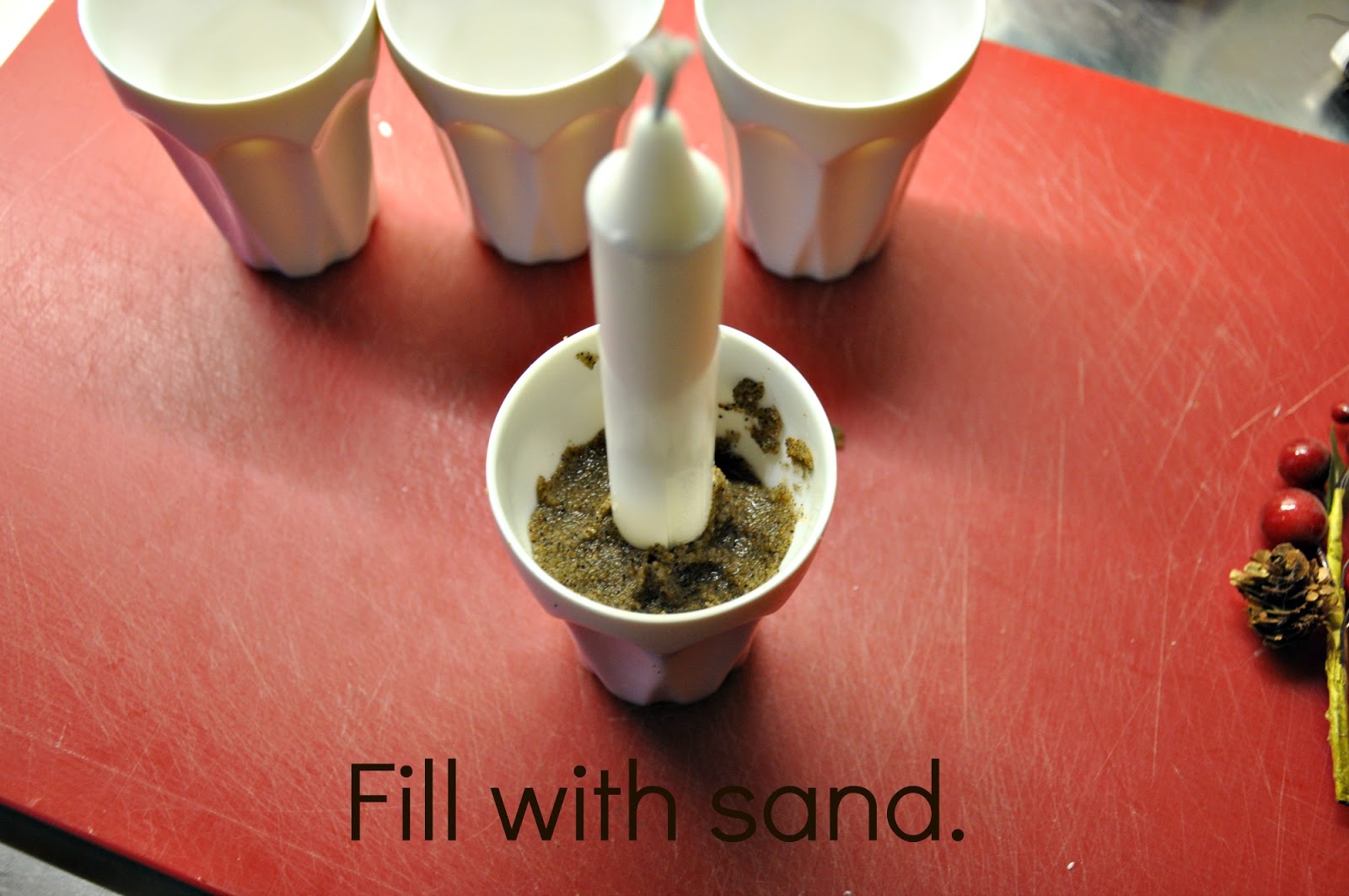 I bought some cheap cups, added sand and decorated with moss and a few faux berries.